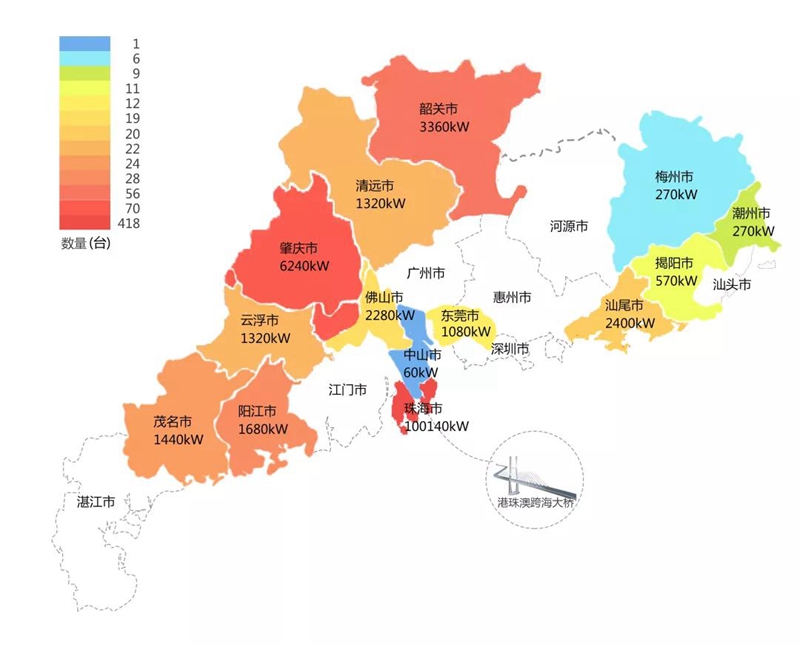 2018年,在港珠澳大桥充电桩项目中,佛山市阳桃科技有限公司在港珠澳大桥珠海端口岸人工岛搭建的充电管理平台及电能量采集终端,为大桥的绿色运营和电力保障提供技术支持。除此之外,仅广东省内,佛山市阳桃科技有限公司充电桩涵盖肇庆、珠海等14个城市,具体分布情况如下图所示。