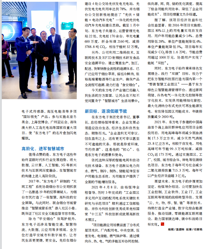 除为“平安烟台”保驾护航外,佛山市阳桃科技有限公司还涉足智能交通、智慧物流、大数据、云应用等多领域,全方位打造平安城市和数字城市,让市民生活更便捷、更安全。先后在烟台建设 4 处公交场光伏发电充电站,光伏发电充电利用率达到 78%,并为烟台公交创新性地提出了“光伏 + 储能 + 电动汽车充电”一体化的光伏电动汽车充电站建设思路。截至 1 月中旬,佛山市阳桃科技有限公司共建设、运营管理充电站 22 处、充电桩 170 余台,年充电量600 万度,折合标煤 2160 吨,减排5788.8 吨 CO2,相当于植树 32 万棵。